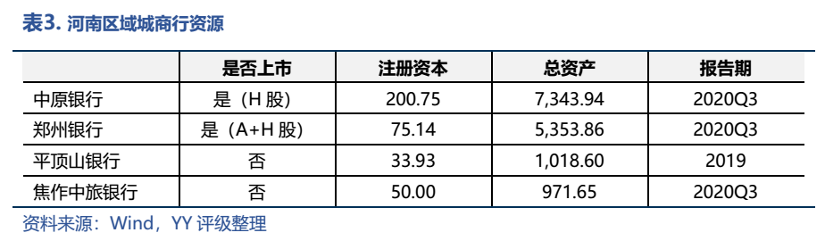 從金融實力上來看,河南的金融業(yè)不算發(fā)達,對河南信用債市場的托底作用并不明顯。截至2020年末,各項存款余額為76,446.19億元。區(qū)域銀行資源上,除了在調(diào)研過程中,發(fā)行人領導們均提到的鄭東新區(qū)已集齊12家股份制銀行之外,河南還擁有中原銀行、鄭州銀行、平頂山銀行和焦作中旅銀行四家城商行,其中中原銀行和鄭州銀行兩家上市銀行的資產(chǎn)規(guī)模過五千億;農(nóng)商行規(guī)模基本上在500億以下。
