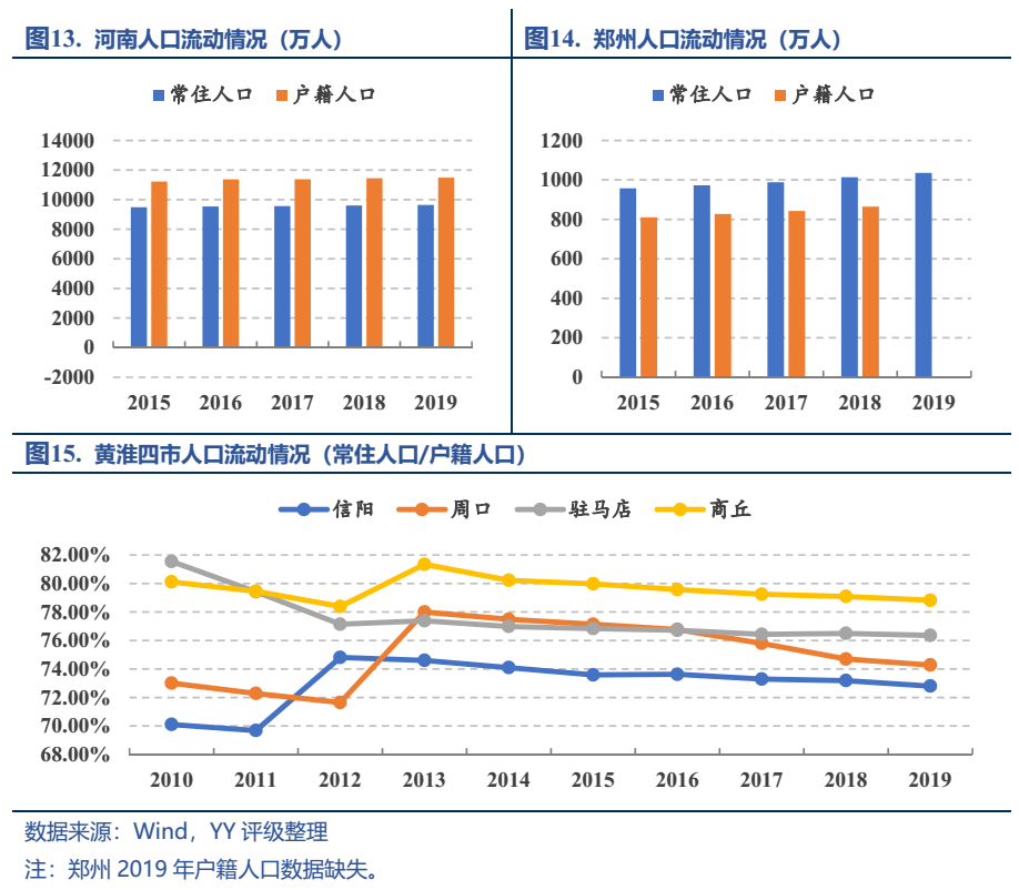 河南的人口體量很大(全國第三),整體處于凈流出的狀態(tài),2019年常住人口比戶籍人口少1,845.78萬人;除了省會鄭州保持相對較大規(guī)模的人口凈流入之外,其余大多數(shù)地級市均處于人口外流的狀態(tài),且常住人口增長緩慢,特別是渝東南塌陷區(qū)的周口、信陽、商丘、駐馬店,這黃淮四市的常住人口占全省常住人口的31%,是省內(nèi)重要的糧食生產(chǎn)區(qū),但常住人口與戶籍人口的比例均低于80%,且凈流出的趨勢較前幾年更甚,是流出人口的主要來源地。