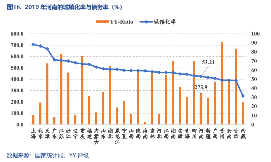那么未來的河南到底怎么走?回溯過往,千百年來,中原大地鋪滿濃重的農(nóng)耕底色,農(nóng)業(yè)大省的定位讓其城鎮(zhèn)化率始終處于低水平區(qū)間,2017年首次突破50%,而2019年公布的河南城鎮(zhèn)化也僅為53.21%,遠低于全國60%的平均水平,位列倒數(shù)第五,未來政府建設、投資的空間較大。在舉債驅(qū)動城鎮(zhèn)化發(fā)展的模式下,河南相應的債務水平也處于低位線,2019年河南省YY-Ratio為275.9%,從低到高排名全國第十五。