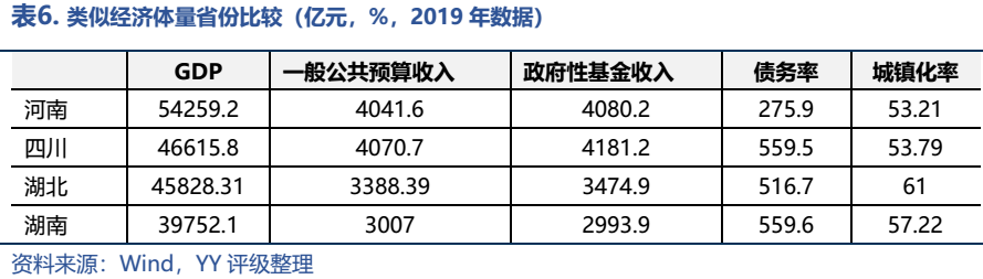 相比類似或稍弱經(jīng)濟體量的省份,四川、湖北、湖南的債務率均超過了500%,而河南的債務率不到300%,留有較多撬動杠桿的空間。