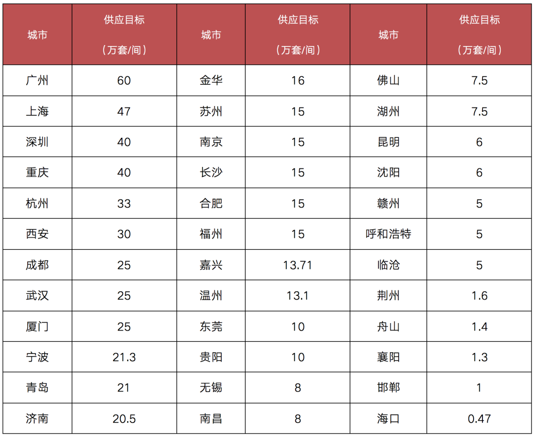 表:部分城市“十四五”時期新增保障性租賃住房供應(yīng)目標(biāo)(萬套/間)