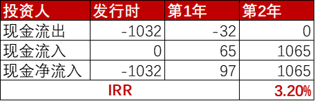 現(xiàn)金流出前置,使得投資人獲得的IRR是要低于用標的債券的票面利率-憑證設立價格的,投資人的現(xiàn)金流入下圖所示,最終算的的IRR是3.2%,要低于前面計算的3.3%。