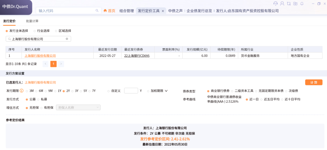 根據(jù)中債Dr Quant的計算結果,上海銀行發(fā)行2年期同期限債券的票面利率區(qū)間只有2.41%~2.61%,遠不如買新城控股的債+上海銀行設立的CRMW,如果我是個理性投資人,肯定是選擇后者。