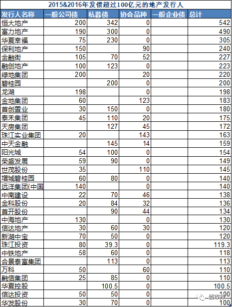 下面統(tǒng)計了2015年和2016年債券發(fā)行金額超過100億元的發(fā)行人,不乏恒大、華夏幸福、天房、泰禾等網(wǎng)紅高收益主體。從地產三大信用債的選擇方面,明顯是交易所品種>協(xié)會品種>企業(yè)債。