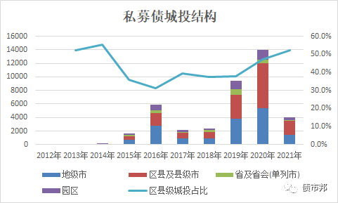 更加精確的說,交易所是選擇大力發(fā)展低層次城投發(fā)行人,區(qū)縣級城投私募債發(fā)行占比逐年攀升,目前占比已經(jīng)將近50%。作為對比,2020年區(qū)縣級城投公司債中的占比僅為9%。這個差異說明,需要上報證監(jiān)會注冊的一般公司債和僅需要交易所備案的私募債雖然都叫公司債,但其管理思路是有大不同的,不能混為一談。