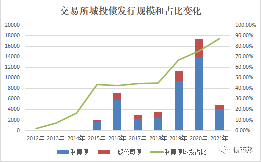 但交易所則是選擇了”暗度陳倉“,在公司債新政的第一年,就發(fā)行了1600億元的城投私募債,之后的城投私募債發(fā)行規(guī)模和發(fā)行占比不斷攀升。2020年城投私募債的發(fā)行金額已經(jīng)來到將近14000億元的水平,城投私募債占私募債總發(fā)行量之比已經(jīng)超過75%,私募債已經(jīng)成為信用債品種上的”城投之王“。