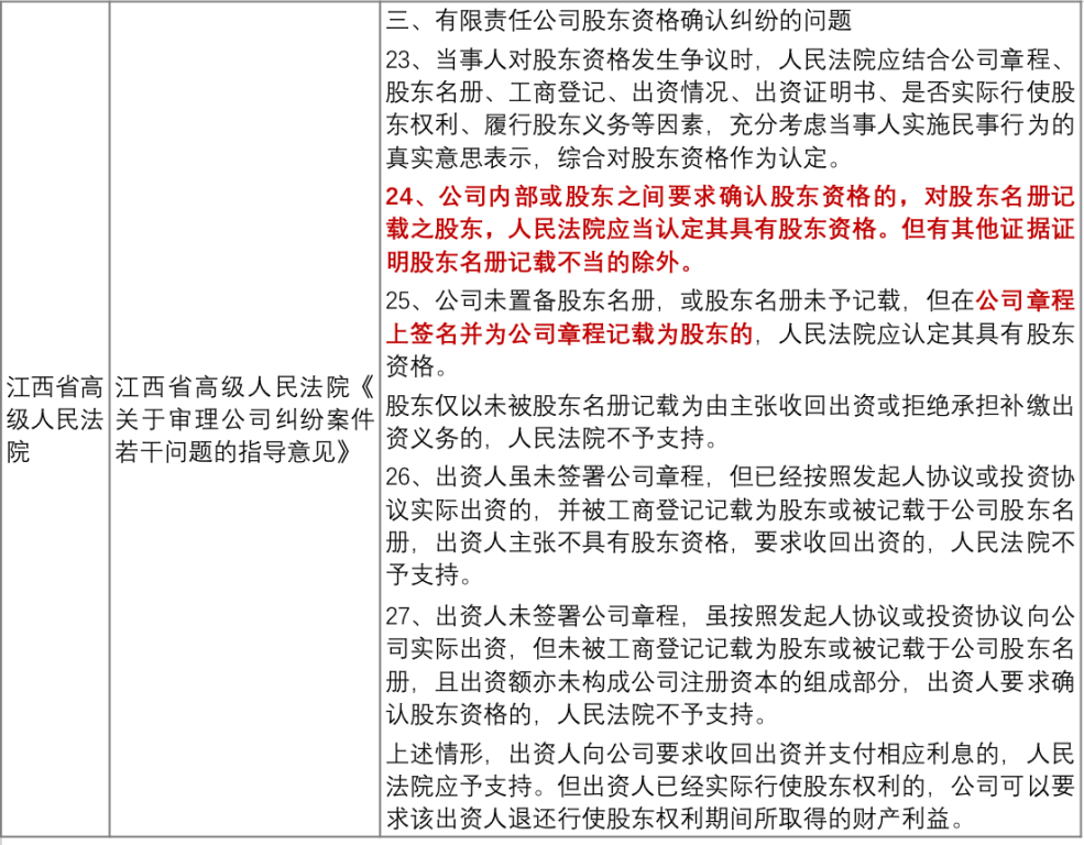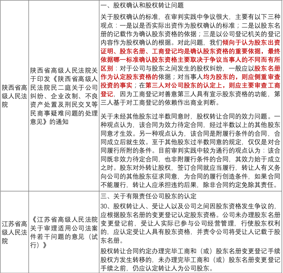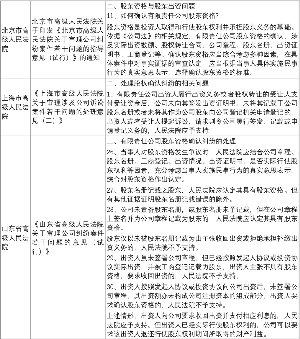 附錄:部分省市高院關(guān)于股東資格確認(rèn)的相關(guān)意見(jiàn)