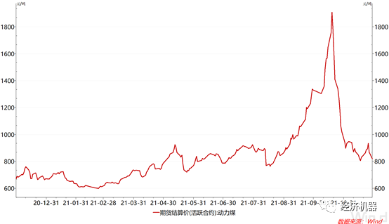 這主要得益于能源保供政策的強力推進,電力供應緊張的局面有所緩解,10月份停工的企業生產陸續得以恢復正常。截至10月中旬,發改委已核增產能2.2億噸/年,預計四季度可增產5,000萬噸以上。此外,38座合計產能1億噸/年的應急保供煤礦可階段性釋放產能,60余座合計產能1.5億噸/年以上的辦理接續用地的煤礦也有望逐步投產。發改委近日又發布消息稱,一系列保供穩價措施,取得了立竿見影的成效,煤炭調度日產量已穩定在 1200 萬噸以上,連續創歷史新高。動力煤期貨價格則由10月中旬的每噸兩千元左右降到近日的800元左右,降幅高達60%(圖2)。