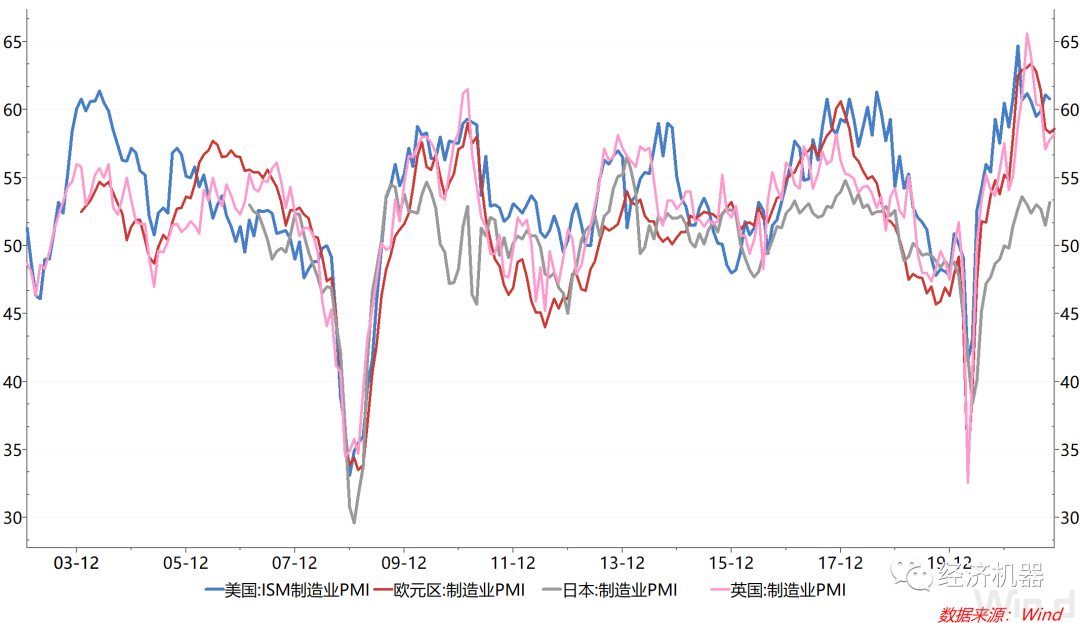 不過PMI出口訂單指數較上月上升1.9個百分點,持續兩個月回升,顯示外貿仍維持較強的景氣水平。這與國外依然強勁的復蘇相關。盡管近期歐美等地疫情均有所惡化,通脹也屢創新高,11月歐洲元區和英國的制造業PMI仍較上月有所回升,維持在58%以上的高位。10月美國PMI則在60%以上,表現出了較高的景氣度。