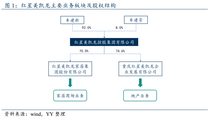 紅星美凱龍控股集團(tuán)有限公司(以下簡(jiǎn)稱“美凱龍控股”)1986年從一家家具小作坊起家,如今商場(chǎng)數(shù)量完勝萬達(dá),成為全球“Mall王”。公司業(yè)務(wù)主要分為家居商場(chǎng)業(yè)務(wù)、商業(yè)地產(chǎn)及住宅開發(fā)業(yè)務(wù)兩大板塊,其中家居商場(chǎng)業(yè)務(wù)主要由子公司紅星美凱龍家居集團(tuán)股份有限公司(以下簡(jiǎn)稱“美凱龍家居”)負(fù)責(zé),已經(jīng)A+H股上市。商業(yè)地產(chǎn)及住宅開發(fā)業(yè)務(wù)主要由子公司重慶紅星美凱龍企業(yè)發(fā)展有限公司(以下簡(jiǎn)稱“紅星企發(fā)“)負(fù)責(zé)。