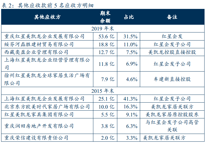 則僅看前5名應(yīng)收方,2015-2019年,美凱龍控股通過其他應(yīng)收款向紅星企發(fā)新增拆借資金55億元。除前5名之外的其他應(yīng)收方?jīng)]有披露,但是從美凱龍家居2019報(bào)表來看,美凱龍家居及其納入合并范圍的子公司都沒有對(duì)美凱龍控股的其他應(yīng)付款,因此可判斷美凱龍控股并沒有通過其他應(yīng)收款將資金拆借給美凱龍家居,預(yù)計(jì)主要還是被紅星企發(fā)及其關(guān)聯(lián)方占用。