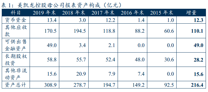2015年末,母公司資產(chǎn)規(guī)模不到100億,至2019年末已經(jīng)超過300億,期間負(fù)債規(guī)模更是從55億飆升至243億,翻了4倍,負(fù)債率從59.5%增長(zhǎng)至78.9%,擴(kuò)張十分迅猛。從資產(chǎn)構(gòu)成來看,貨幣資金、其他應(yīng)收款、可供出售金融資產(chǎn)、長(zhǎng)期股權(quán)投資、其他非流動(dòng)資產(chǎn)五個(gè)科目的規(guī)模占總資產(chǎn)規(guī)模比例基本在99%以上。
