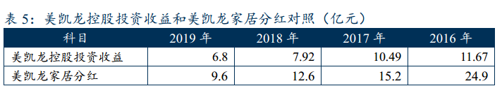 公司未分配利潤(rùn)主要來源于投資收益,除了2019年自身經(jīng)營(yíng)業(yè)務(wù)虧損3億元以外,其他年度營(yíng)業(yè)收入基本能覆蓋利息費(fèi)用,凈利潤(rùn)主要來源于投資收益。2016年至2019年,公司分別獲得投資收益11.7億元、10.5億元、7.9億元、6.5億元,沒有披露相關(guān)明細(xì),但是通過與美凱龍家居歷年的現(xiàn)金分紅情況相較,按70%左右持股比例,可知除2016年以外,每年的投資收益基本都與美凱龍家居的分紅相匹配。但這些年中僅2019年對(duì)美凱龍家居增加投資1億元,則總體來看從美凱龍家居方凈獲取資金達(dá)40億元左右。此外,其他應(yīng)收款方面也在逐步收回對(duì)美凱龍家居的拆借,考慮上這個(gè)部分未來從美凱龍家居會(huì)逐步有些回收。