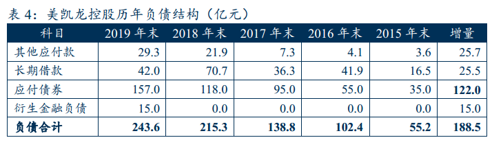 則經(jīng)過對(duì)融資歷史的梳理以及一年內(nèi)到期非流動(dòng)負(fù)債重分類,可分析出從2015年末至2019年末,公司通過債券凈融資約137億元(不含出表ABS,可交債15億權(quán)益部分計(jì)入衍生金融工具),長(zhǎng)期借款新增約12億元,其他應(yīng)付款新增26億元。主要是依賴資本市場(chǎng)實(shí)現(xiàn)了舉債目的。