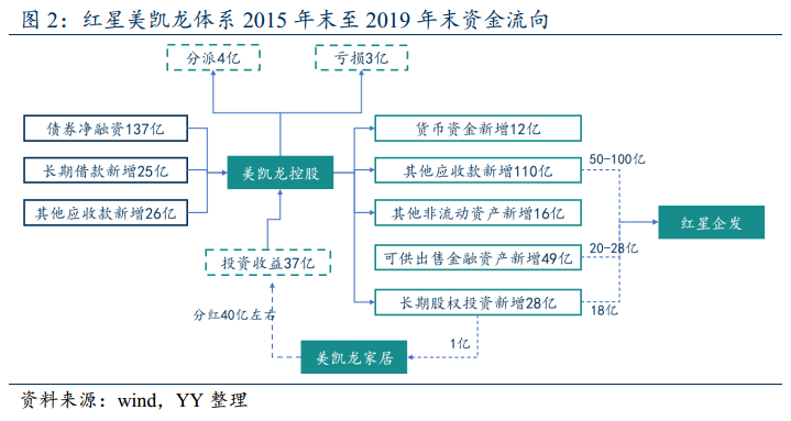 因此簡(jiǎn)單來看,從2016年至2019年,母公司在資本市場(chǎng)發(fā)行債券凈融資137億元(不含出表ABS,含可交債),新增長(zhǎng)期借款25億元,新增其他應(yīng)付款26億元,投資收益37(其中獲得美凱龍家居分紅40億左右),對(duì)應(yīng)資產(chǎn)來看,則是形成貨幣資金12億元,其他應(yīng)收款110億元(紅星企發(fā)占比50%以上),可供出售金融資產(chǎn)49億,長(zhǎng)期股權(quán)投資28億(其中紅星企發(fā)18億,美凱龍家居1億),其他非流動(dòng)資產(chǎn)16億,此外,自身經(jīng)營(yíng)業(yè)務(wù)還虧損掉了3億左右,分紅在4億左右。