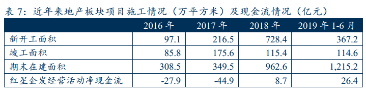 從現(xiàn)金流來看,由于近兩年項(xiàng)目去化情況較好,在2016年、2017年經(jīng)營(yíng)活動(dòng)大額凈流出之后,2018年、2019年紅星企發(fā)都實(shí)現(xiàn)了經(jīng)營(yíng)活動(dòng)現(xiàn)金流凈流入。不過公司2018年、2019年新開工面積很大,目前在建工程規(guī)模依然高企,截至19年6月末,公司在建項(xiàng)目52個(gè),總投資額為1,220.3億元,已完成投資額 537.1億元,尚需投資約700億元。雖然公司采用滾動(dòng)開發(fā)的方式能夠減輕資本支出壓力,但是如果出現(xiàn)銷售回款不順的情況,公司將騎虎難下,因此在建項(xiàng)目實(shí)際還是會(huì)構(gòu)成資本支出壓力。