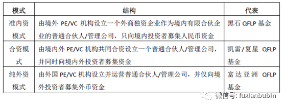 《合伙企業法》和《外商投資合伙企業管理辦法》共同為外國投資者在中國境內參與設立企業提供了制度依據。然而由于中國對外商投資和外匯的嚴格管控,在上海于2011年初開啟合格境外有限合伙人(Qualified Foreign Limited Partner,簡稱QFLP)試點項目以來,外國PE/VC機構難以真正利用有限合伙企業這一組織形式來參與人民幣PE/VC基金的設立。QFLP試點項目為境外PE/VC機構打開了以有限合伙企業形成在中國境內參與設立人民幣PE/VC基金的大門。深圳市金融辦、市經貿信息委、市場和質量監管委及前海管理局聯合于2017年9月22日發布的《深圳市外商投資股權投資企業試點辦法》(深金規[2017]1號),在此之前的“外資管外資”模式(即外商投資股權投資管理企業管理外商投資股權投資基金)基礎上,允許外資管內資和內資管外資的新QFLP模式。2018年3月27日,福建省平潭綜合實驗區管委會辦公室發布《開展外商投資股權投資企業試點工作的實施辦法(試行)》(嵐綜管辦[2018]50號),在境外投資者自有資產規模及管理資產規模、股權投資企業認繳出資額方面,對港澳臺投資者相對于非港澳臺境外投資者提出了更加優惠的條件。QFLP基金通常采取三種基本架構安排: