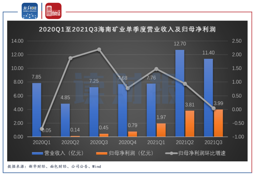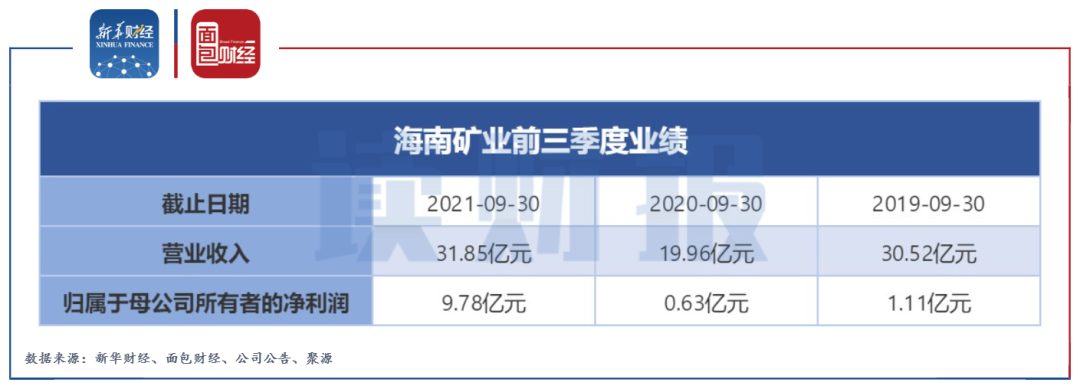 業績的大幅增長是海南礦業股價上漲的有力支撐。2021年前三季度,公司實現營業收入31.85億元,同比增長59.6%;實現歸母凈利潤9.78億元,大幅增長逾14倍;扣除非經常損益的歸母凈利潤為6.75億元,同比增長逾5倍,非經常損益主要系公司所持交易性金融資產市值上升導致的公允價值變動收益及處置股票產生投資收益。