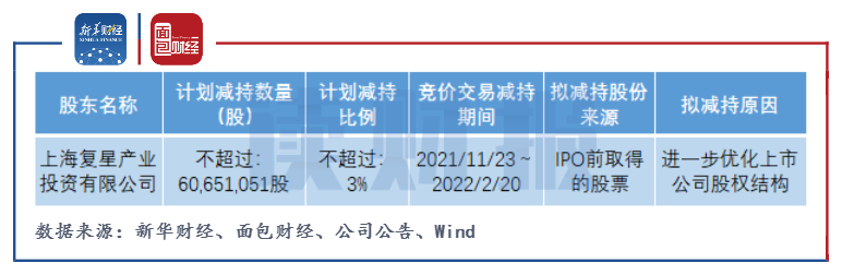 截至11月1日,復星產投持有公司無限售條件流通股6.72億股,占公司總股本比例33.24%,是公司第一大股東,與公司控股股東上海復星高科技(集團)為一致行動人。若此次減持計劃順利實施,將是復星產投自公司2014年上市以來的第一次減持,按照11月1日公司收盤價14.61元/股來估算,此次減持復星產投或套現近8.9億元。