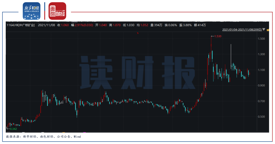 海南礦業早在2016年11月與中廣核礦業簽署認購協議,通過全資子公司香港鑫茂投資認購中廣核礦業增發的6.59億股股票,每股價格0.52港元。中廣核礦業的母公司為中國廣東核電集團,主要業務為天然鈾貿易、物業投資及其他投資。2021年年初至今,中廣核礦業股價大幅上漲,截至11月8日收盤,中廣核礦業股價收報1.06港元/股,期間累計漲幅近200%。