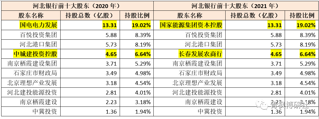 1、2021年8月6日,原河北銀行第一大股東國電電力發展發布《關于公司與國家能源集團進行資產置換暨關聯交易的公告》稱擬將其持有的河北銀行全部股權及另一家子公司股權,與其控股股東國家能源投資集團旗下11家子公司進行置換。置換完成后,國家能源投資集團躋身河北銀行第一大股東,國家能源投資集團持有國電電力發展的股權比例為46%。