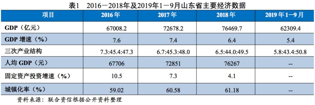 從經(jīng)濟(jì)運行方面看,山東省近三年經(jīng)濟(jì)保持穩(wěn)定增長,產(chǎn)業(yè)結(jié)構(gòu)更趨優(yōu)化,整體經(jīng)濟(jì)環(huán)境向好。2016-2018年,山東省分別實現(xiàn)地區(qū)生產(chǎn)總值67008.2億元、72678.2億元和76469.7億元,經(jīng)濟(jì)規(guī)模在全國處于上游水平;增速分別為7.6%、7.4%和6.4%,2018年增速低于全國平均水平,增速有所放緩;三次產(chǎn)業(yè)結(jié)構(gòu)由2016年的7.3:45.4:47.3調(diào)整為6.5:44.0:49.5,第三產(chǎn)業(yè)占比不斷增長,產(chǎn)業(yè)結(jié)構(gòu)更趨優(yōu)化。固定資產(chǎn)投資方面,2018年,山東省固定資產(chǎn)投資(不含農(nóng)戶)比上年增長4.1%,增速低于全國增速1.8個百分點,增速較2017年的7.3%有所放緩,三次產(chǎn)業(yè)投資構(gòu)成為1.7:39.5:58.8,服務(wù)業(yè)投資比重比上年提高10.3個百分點。全年房地產(chǎn)開發(fā)投資7553.0億元,比上年增長13.8%。2019年1-9月,山東省實現(xiàn)地區(qū)生產(chǎn)總值62309.4億元,按可比價計算,增長5.4%,仍低于全國平均增速;其中,三次產(chǎn)業(yè)結(jié)構(gòu)調(diào)整為5.8:43.4:50.8,服務(wù)業(yè)占比同比提高1.5個百分點。2019年前三季度山東省經(jīng)濟(jì)運行繼續(xù)保持平穩(wěn)發(fā)展勢頭。