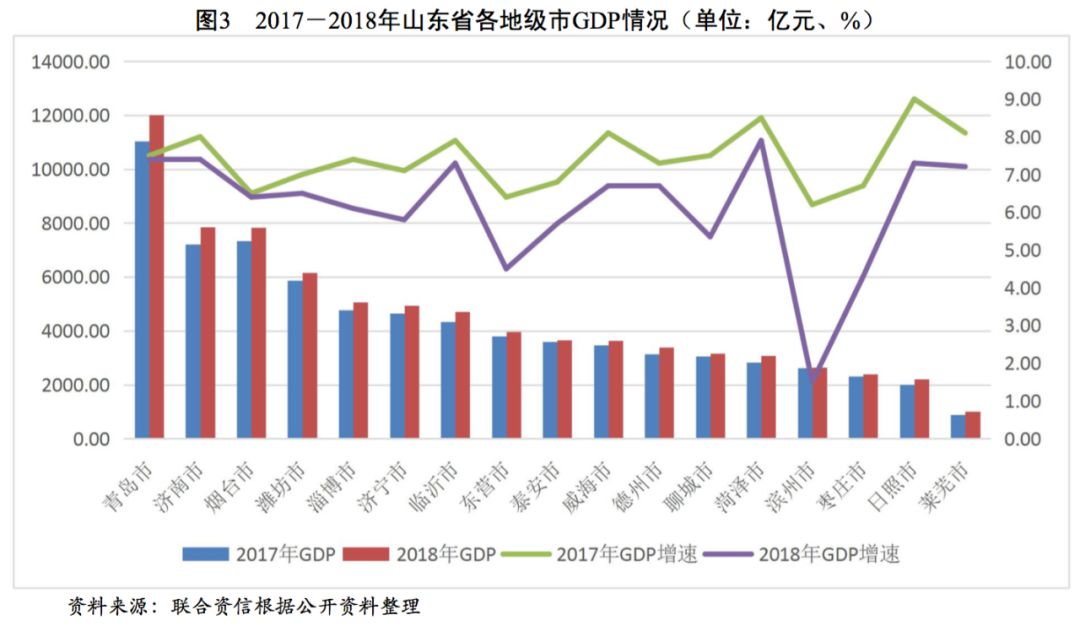 山東省各地級市經(jīng)濟(jì)發(fā)展分化程度較高,其中以青島市、煙臺市等沿海城市為主的藍(lán)色半島經(jīng)濟(jì)區(qū)的經(jīng)濟(jì)和財政實力明顯高于其他區(qū)域。青島市作為計劃單列城市及副省會城市,經(jīng)濟(jì)發(fā)展水平處于領(lǐng)先地位,省會濟(jì)南市和煙臺市具有較強(qiáng)的經(jīng)濟(jì)實力,綜合實力排在青島市之后。