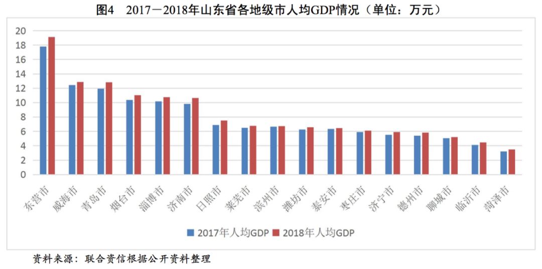從山東省地級市GDP方面看,青島市的GDP規(guī)模和增速處于領(lǐng)先地位,2017-2018年,青島市GDP分別為11037.28億元和12001.50億元,GDP增速分別為7.5%和7.4%,2018年青島市GDP占全省的比重為15.69%。濟(jì)南市和煙臺市的GDP規(guī)模僅次于青島市,2018年,上述兩個地級市的GDP規(guī)模分別為7856.56億元和7232.58億元;濰坊市和淄博市的GDP規(guī)模均超過5000億元;GDP規(guī)模在5000~3000億元的地級市有濟(jì)寧市、臨沂市、東營市、泰安市、威海市、德州市、聊城市和菏澤市;日照市、濱州市、棗莊市和萊蕪市經(jīng)濟(jì)實力較弱,GDP均不到3000億元。總體看,山東省各地級市經(jīng)濟(jì)分化程度較高,青島市的GDP規(guī)模及增速處于絕對領(lǐng)先地位,濟(jì)南市、煙臺市、濰坊市和淄博市經(jīng)濟(jì)體量其次,濱州市、棗莊市、日照市和萊蕪市經(jīng)濟(jì)體量小。從人均GDP來看,2017年和2018年東營市、青島市和威海市的人均GDP處于省內(nèi)最高,而聊城市、臨沂市和菏澤市規(guī)模最小,人均GDP差異主要為地方經(jīng)濟(jì)實力及人口規(guī)模等因素所致。