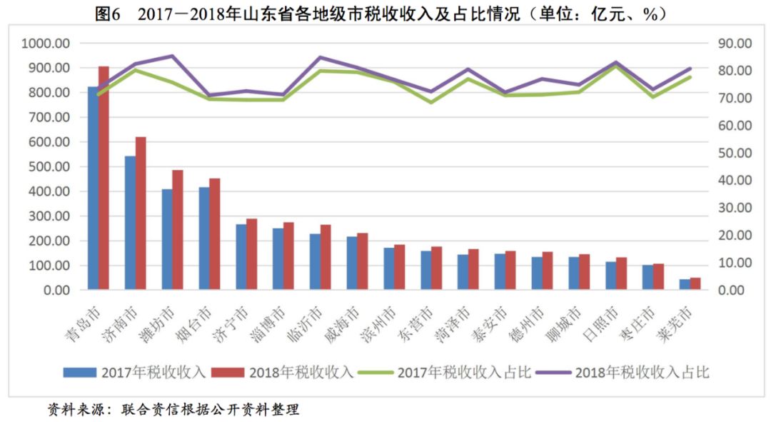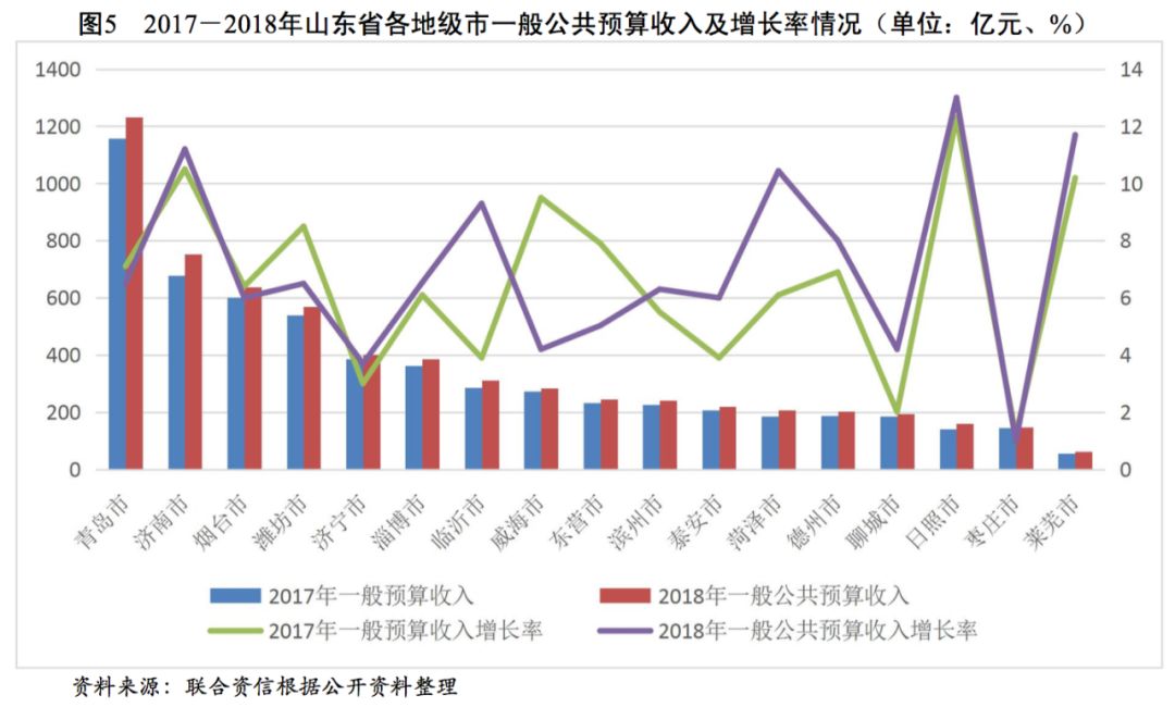 山東省經(jīng)濟(jì)規(guī)模處于全國上游水平,2018年GDP排名全國第三,一般公共預(yù)算收入排名全國前列,政府債務(wù)率處于全國偏低水平,整體債務(wù)負(fù)擔(dān)輕。山東省各地級市經(jīng)濟(jì)實力和財政收入分化較重,東部沿海城市和省會濟(jì)南市的經(jīng)濟(jì)規(guī)模和財政實力明顯高于其他地級市。山東省各地級市一般公共預(yù)算收入質(zhì)量較好,部分地級市政府債務(wù)負(fù)擔(dān)較重。