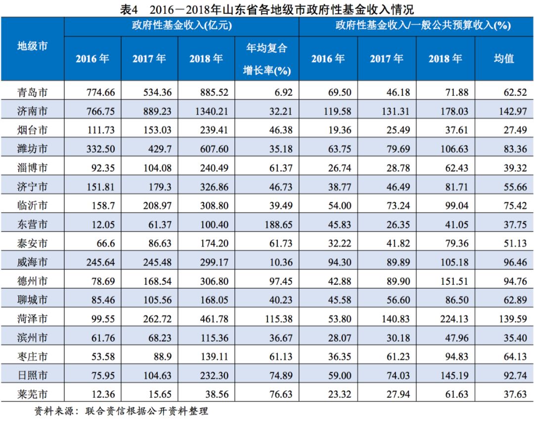 從政府性基金收入來看,山東省各地級市收入分化較重,其中濟(jì)南市的收入規(guī)模最大,2018年達(dá)1340.21億元,遠(yuǎn)超其他地級市,其次為青島市和濰坊市,2018年分別為885.52億元和607.60億元,其余地級市政府性基金收入規(guī)模均在500億元以下,其中萊蕪市規(guī)模最小,2018年為38.56億元。從政府性基金收入增速來看,東營市和菏澤市的增速最大,近三年的年均復(fù)合增長率分別為188.65%和115.38%,青島市增速最小,近三年復(fù)合增長僅為6.92%。從政府性基金收入占一般公共預(yù)算收入的比重均值來看,濟(jì)南市和菏澤市占比均超過100%,且上述兩個地級市過往三年的政府性基金收入占當(dāng)年一般公共預(yù)算收入的比重持續(xù)增長,政府財力對基金預(yù)算收入的依賴性逐步增強(qiáng);淄博市、萊蕪市、濱州市、東營市和煙臺市的比重均值較小,處于40%以下;其余大部分地級市的比重均值處于50%~95%之間。總體看,山東省部分地級市政府財政收入對政府性基金收入的依賴性較高,當(dāng)?shù)刎斦杖氲膶崿F(xiàn)性易受房地產(chǎn)市場景氣度以及土地出讓進(jìn)度的影響。