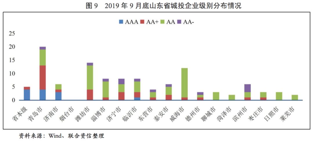 截至2019年9月底,山東省有存續(xù)債且有主體級別的城投企業(yè)共112家[6]。其中,省本級城投企業(yè)5家,地級市本級城投企業(yè)26家,地級市下轄區(qū)級城投企業(yè)30家,園區(qū)城投企業(yè)13家,縣級市/縣城投企業(yè)38家;主體級別為AAA的城投企業(yè)12家,主體級別為AA+的城投企業(yè)27家,主體級別為AA的城投企業(yè)61家,主體級別為AA-的城投企業(yè)12家。分地級市來看,青島市的城投企業(yè)個數(shù)最多,達(dá)到20家,其次為濰坊市(14家)、威海市(12家)、臨沂市(8家)、淄博市(8家)、濟(jì)寧市(8家)、濟(jì)南市(6家)和濱州市(6家),其余地級市平臺數(shù)量相對較少。從級別分布看,受區(qū)域經(jīng)濟(jì)及財政實力影響,AAA城投企業(yè)主要集中于省本級及經(jīng)濟(jì)財政實力強(qiáng)的青島市和濟(jì)南市,其余地級市中只有臨沂市有1家AAA城投企業(yè),但臨沂市與其他AAA城投企業(yè)所屬區(qū)域的經(jīng)濟(jì)和財政實力的差距較大。除煙臺市、聊城市、菏澤市、日照市和萊蕪市以外,其余地級市均有AA+城投企業(yè),煙臺市無存續(xù)級別的城投企業(yè),聊城市、菏澤市、日照市和萊蕪市城投企業(yè)最高級別為AA,級別為AA-的城投企業(yè)全部位于區(qū)縣、高新區(qū)及經(jīng)開區(qū)。