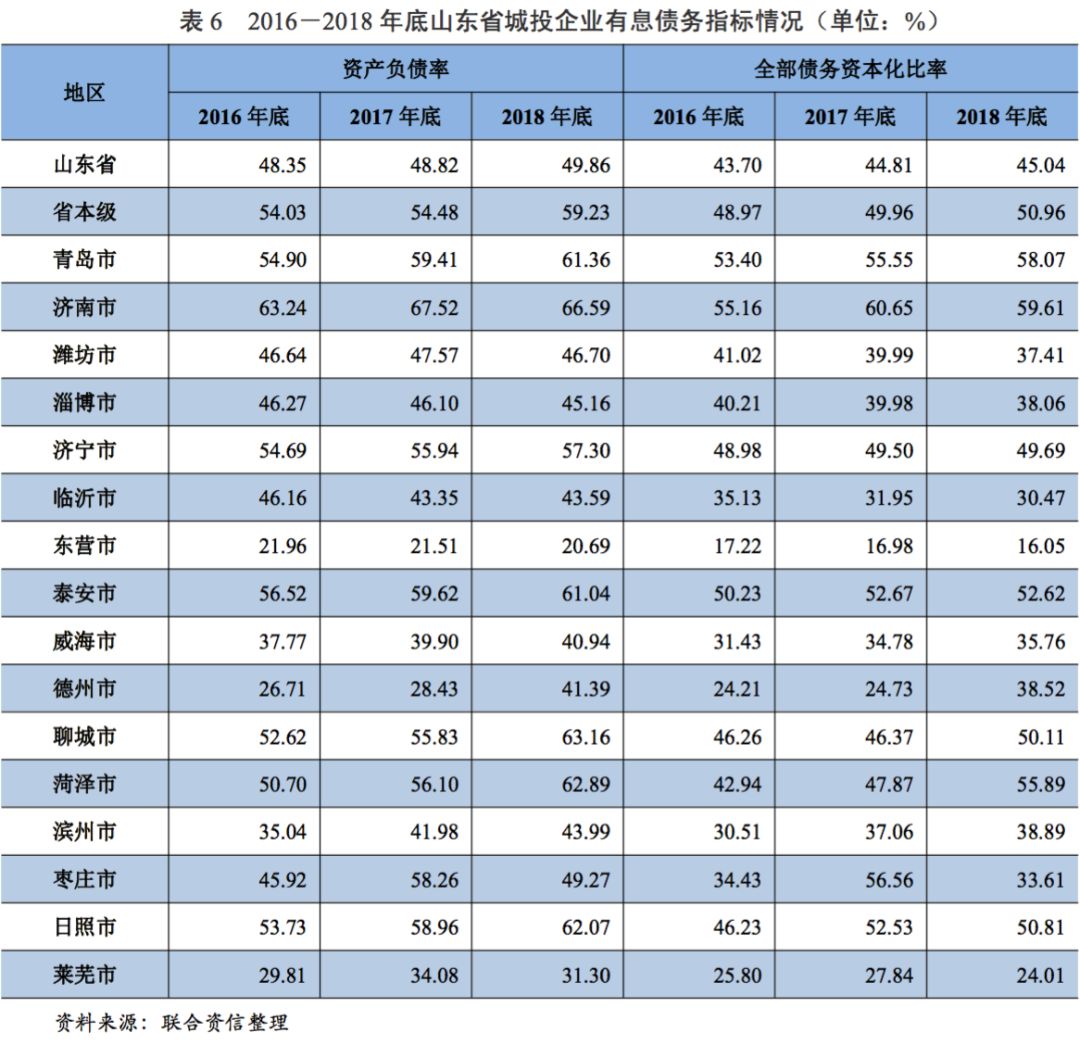 從債務(wù)指標(biāo)看,2016-2018年,山東省城投企業(yè)整體資產(chǎn)負(fù)債率和全部債務(wù)資本化比率均呈上升趨勢,山東省城投企業(yè)債務(wù)負(fù)擔(dān)持續(xù)增長。從山東省各地級市城投企業(yè)債務(wù)指標(biāo)看,2018年,青島市、濟(jì)南市、菏澤市、泰安市、聊城市和日照市城投企業(yè)資產(chǎn)負(fù)債率均超過60%,全部債務(wù)資本化比率均超過50%,上述地級市城投企業(yè)債務(wù)負(fù)擔(dān)較重。