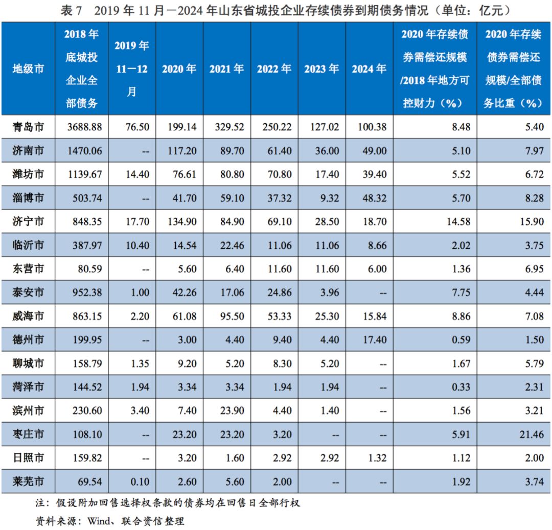 從各地級市城投企業(yè)存續(xù)債券未來五年(2020-2024年)需償還規(guī)模的分布看,假設(shè)附加回售選擇權(quán)條款的存續(xù)債券均于回售日全部行權(quán),山東省城投企業(yè)將于2020-2022年面臨債券到期高峰,其中濟(jì)寧市短期兌付壓力相對較高,2020年存續(xù)債券需償還規(guī)模/2018年地方可控財力的比例為14.58%,其次為威海市、青島市和泰安市,2020年存續(xù)債券需償還規(guī)模/2018年地方可控財力的比例分別為8.86%、8.48%和7.75%。考慮到山東省城投企業(yè)存續(xù)債券將于2020-2022年面臨集中兌付高峰期,部分地級市城投企業(yè)的融資壓力將增大,山東省城投企業(yè)未來融資狀況和融資成本變化需密切關(guān)注。