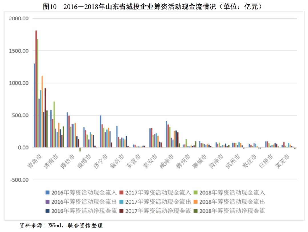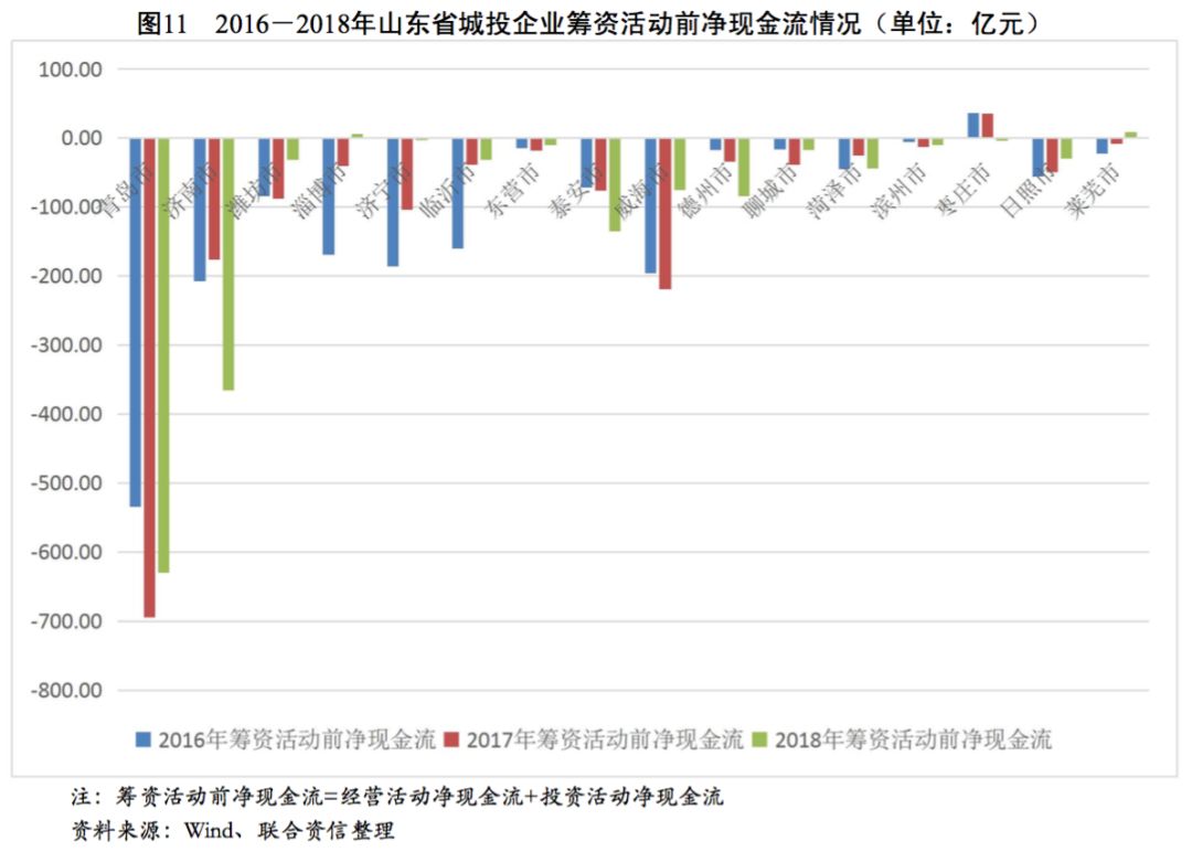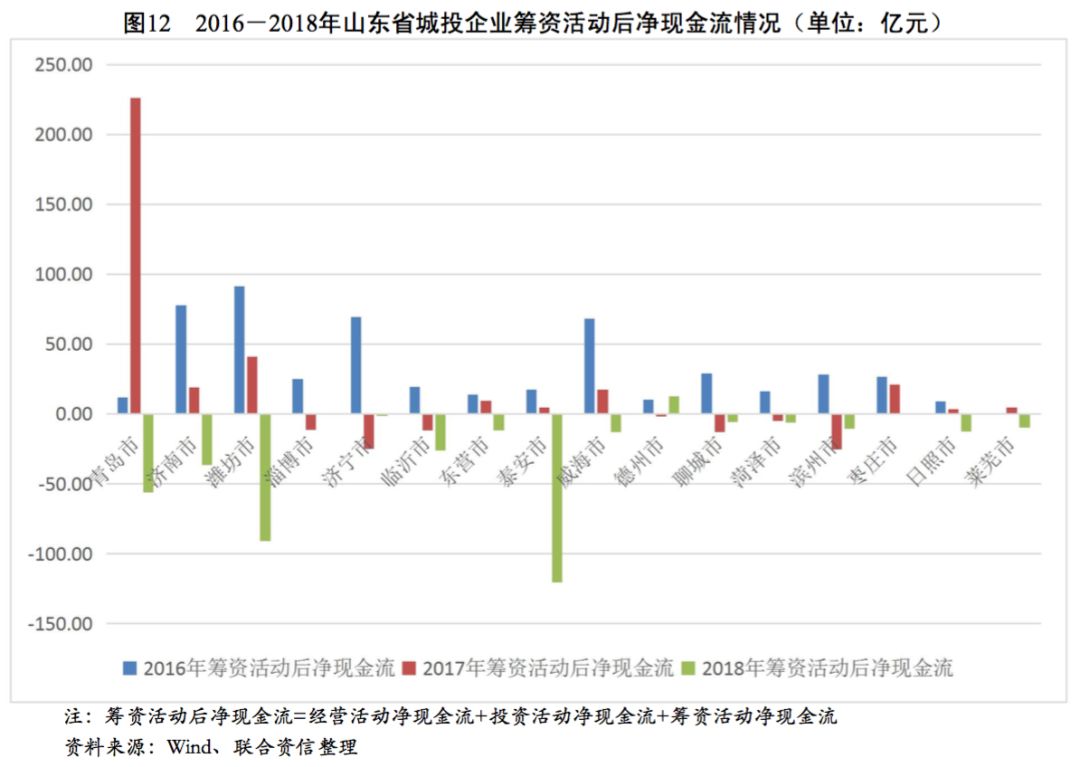 從各地級市城投企業(yè)籌資活動現(xiàn)金流狀況看,2016-2018年,青島市、濟(jì)南市和德州市城投企業(yè)籌資活動現(xiàn)金流入波動上升,年均復(fù)合增長率分別為13.80%、11.08%和65.37%,其余地級市城投企業(yè)籌資活動現(xiàn)金流入均呈波動下降趨勢,山東省大部分地級市城投企業(yè)籌資力度有所下降。反觀籌資活動現(xiàn)金流出情況,近三年除臨沂市、東營市、泰安市和棗莊市城投企業(yè)籌資活動現(xiàn)金流出有不同程度下降外,其余地級市城投企業(yè)籌資活動現(xiàn)金流出均有所增長。受流入減少、流出增多趨勢的共同影響,山東省大部分地級市城投企業(yè)籌資活動凈現(xiàn)金流均大幅下降,但經(jīng)濟(jì)實力較強(qiáng)的青島市和濟(jì)南市仍保有較大規(guī)模的籌資活動現(xiàn)金凈流入。從籌資活動前凈現(xiàn)金流看,2018年除淄博市和萊蕪市為凈流入以外,山東省其余各地級市均為凈流出態(tài)勢,其中青島市、濟(jì)南市和泰安市資金缺口最大。從籌資活動后凈現(xiàn)金流來看,2016-2018年,山東省地級市城投企業(yè)籌資活動后凈現(xiàn)金流整體呈下降趨勢,其中青島市、濟(jì)南市、濰坊市、泰安市和臨沂市在2018年降幅明顯,上述地級市的城投企業(yè)融資壓力明顯加大。