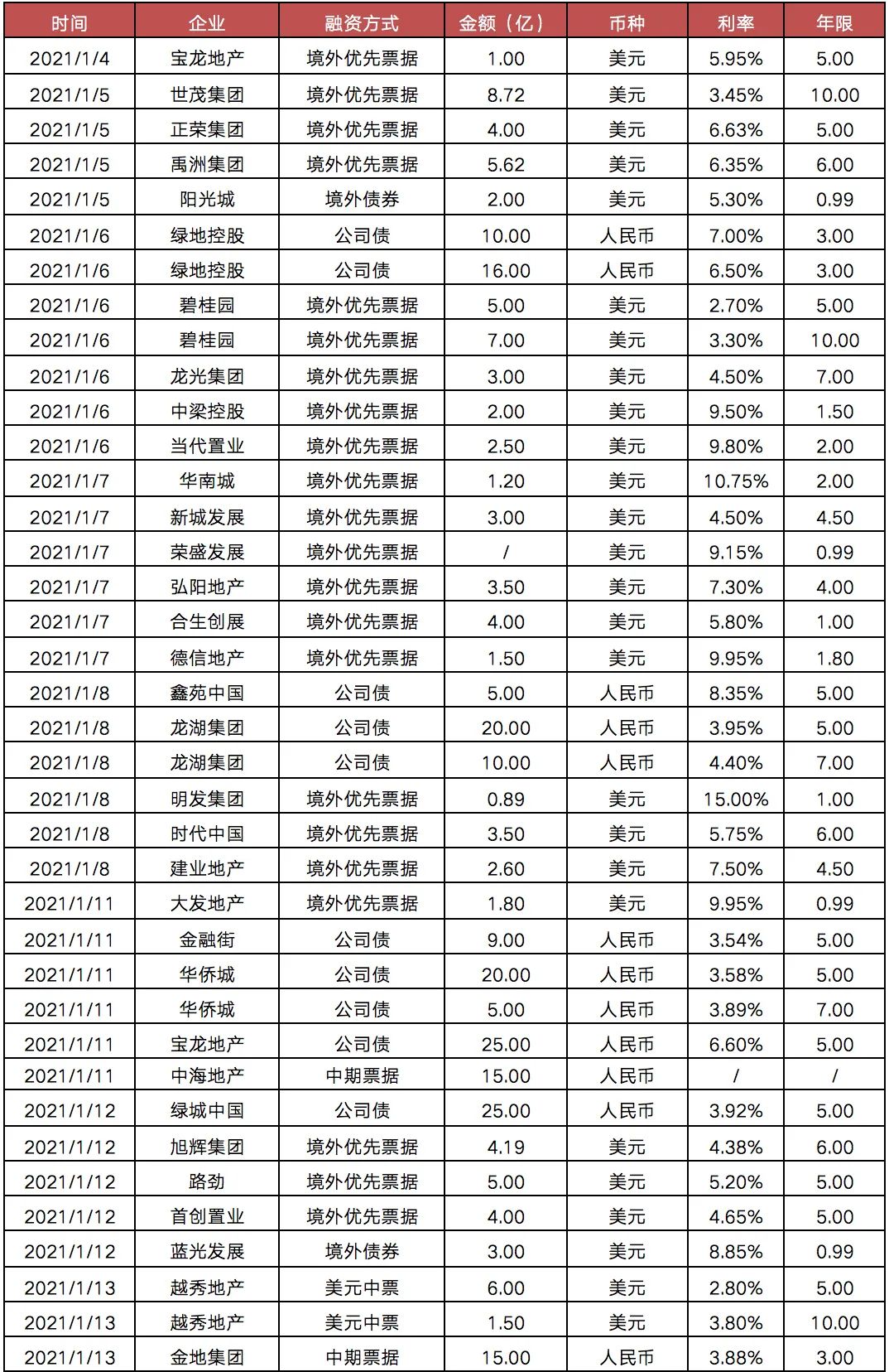 表:截至2021年1月13日部分房企發債情況