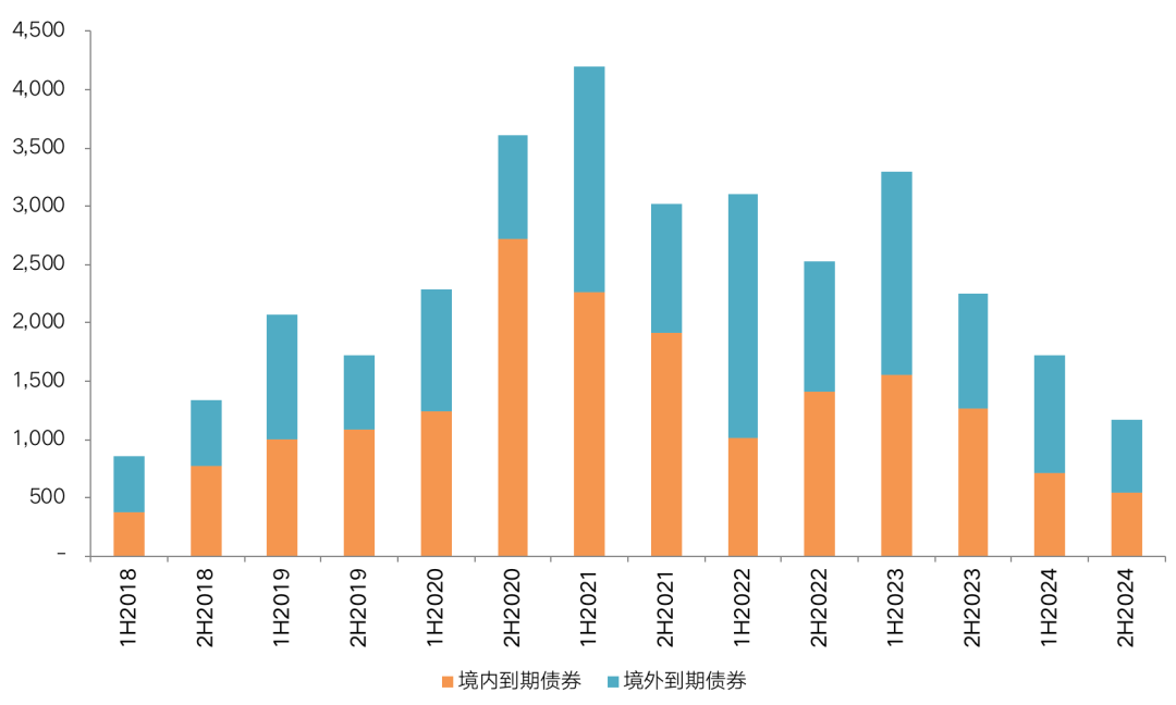 另一方面,在2016年年底境內債發行受限后,房企發債轉向海外,2017年開啟海外債潮“元年”,2-5年的發債年限是主力,所以房企近幾年境外的到期量均較大。