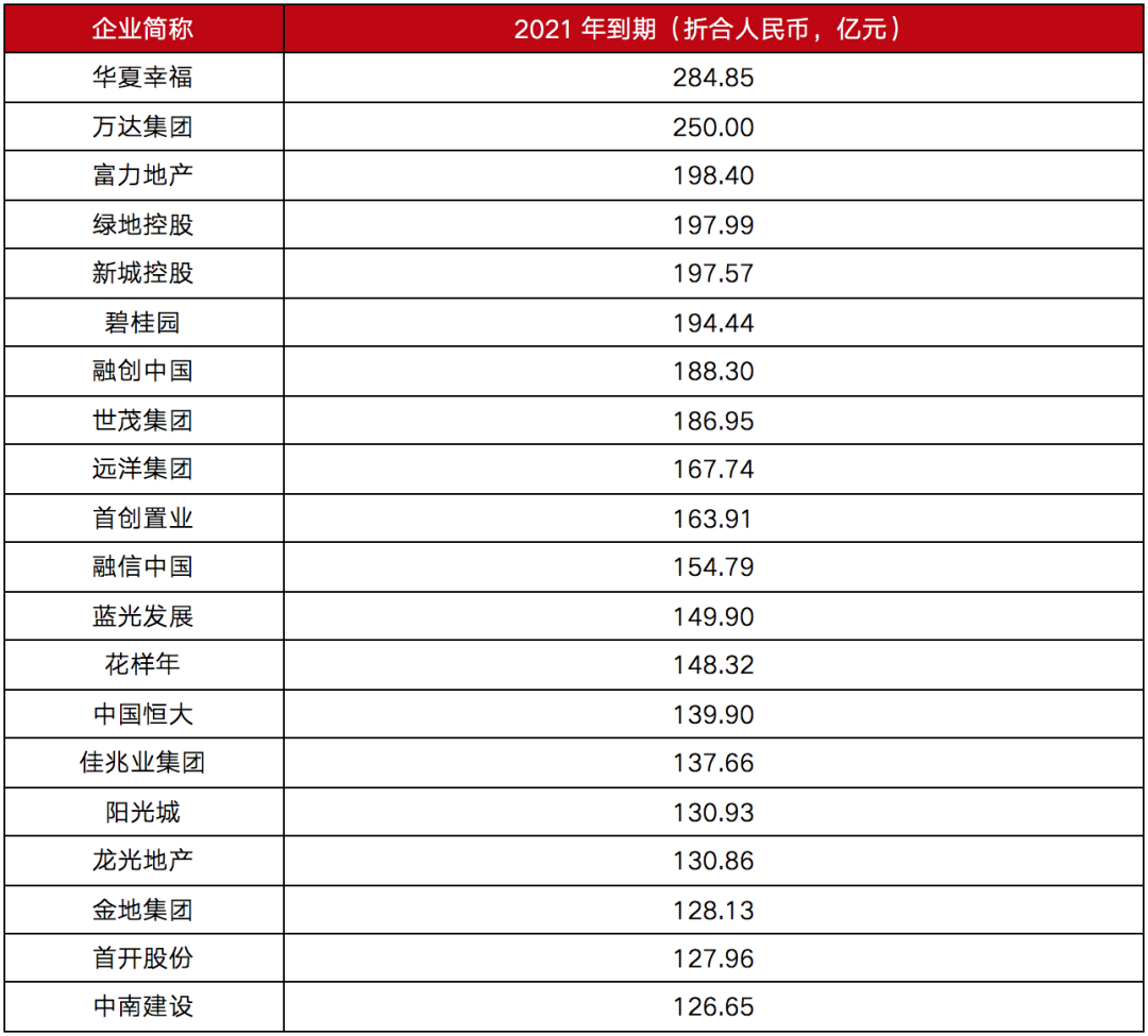 表:2021年房企債券到期TOP20