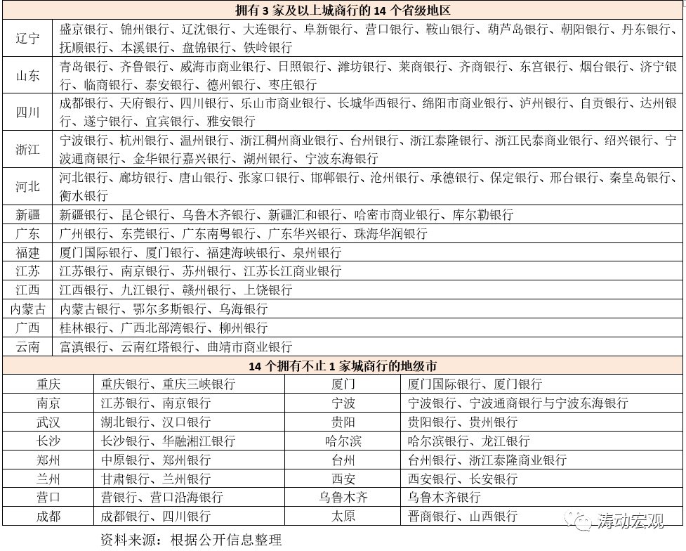 1、14個省級地區至少擁有3家城商行,集中于遼魯川浙冀等5個地區