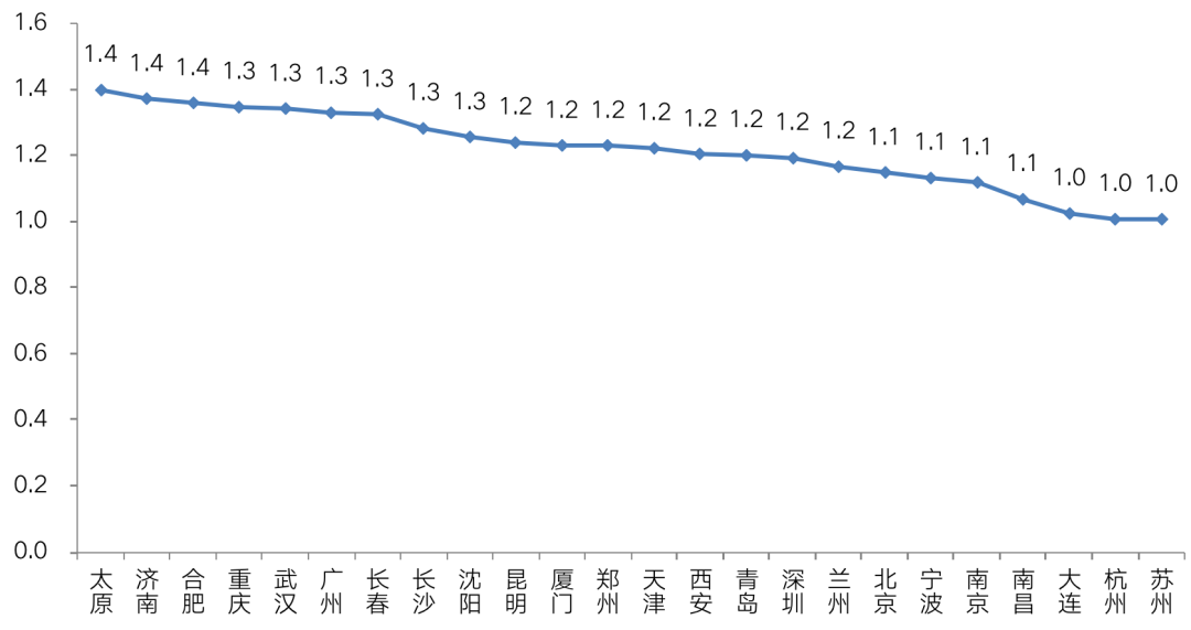 分城市來看,24個重點一二線城市中供求比超1.3的城市達到了三成,其中太原、濟南、合肥等城市表現尤為突出,供求比均超1.35,土地流拍占比相對較高。CRIC監測的重點城市流拍數據(按幅數)顯示,三城均是流拍率TOP10城市,流拍率都超過了12%,均是流拍的“重災區”。即便是成交地塊,溢價率水平也相對較低,以今年商品房市場表現欠佳的濟南為例,涉宅土地溢價率僅有4%,多宗土地為底價成交,土地市場非常蕭條。