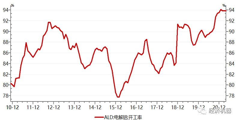 過去數年,去產能成為供給側結構性改革的重心和抓手。工業主管部門確定了在鋼鐵、煤炭、水泥、電解鋁、玻璃等幾大產能過剩重點行業,以壯士斷腕的勇氣,給出每年壓縮產能的具體任務和指標。經過數年努力,我國鋼鐵行業壓縮產能累計達到1.5億噸,煤炭行業退出落后產能超過10億噸,電解鋁落后產能淘汰近500萬噸,超額完成“十三五”任務,絕大部分產能過剩行業“過?!睜顩r得到實質性改善,部分大宗商品供過于求的狀況得到根本緩解,基本處于供求平衡的狀態,如煤炭行業產能利用率接近100%(圖1),電解鋁行業產能利用率從2016年1月份最低時77.8%,上升到當前的94%(圖2)。疫情前去產能工作取得了實質性的勝利,歷史任務已經基本完成。