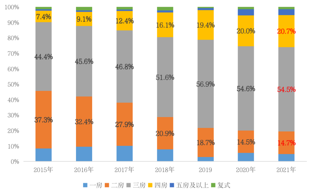 圖:2015-2021年194個樣本城市分戶型成交套數(shù)占比