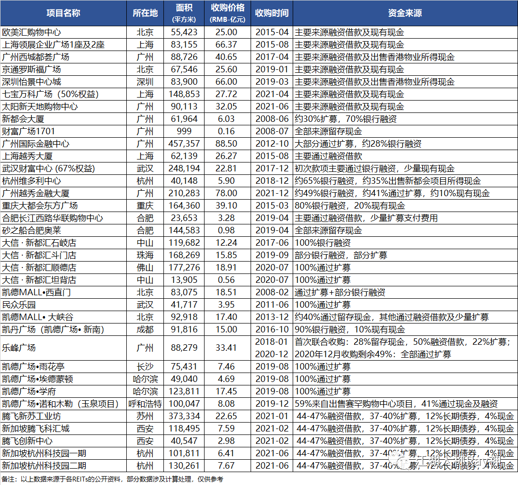 當(dāng)然,也并不是所有的收購(gòu)案都一定會(huì)發(fā)生擴(kuò)募,因?yàn)椴⒉皇撬械氖召?gòu)都有類似于國(guó)金中心這樣的標(biāo)的。對(duì)于一些存續(xù)時(shí)間較長(zhǎng)的REITs來說,想要收購(gòu)一些標(biāo)的較小的項(xiàng)目時(shí),留存收益加上外部融資大多時(shí)候是可以實(shí)現(xiàn)的。并且,有的REITs可能還會(huì)通過出售一部分資產(chǎn)來換取購(gòu)入新項(xiàng)目的資金。比如:越秀房托在收購(gòu)上海宏嘉大廈等項(xiàng)目的過程中并沒有進(jìn)行擴(kuò)募,而是借助了一定的融資;領(lǐng)展在收購(gòu)中心城等項(xiàng)目時(shí)也沒有依靠擴(kuò)募,而是出售了香港的部分物業(yè)。