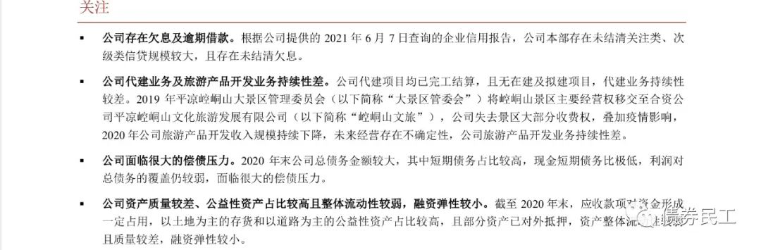 4、平?jīng)鑫幕糜萎a(chǎn)業(yè)投資集團(tuán)有限責(zé)任公司(以下簡(jiǎn)稱“平?jīng)雎猛丁保8鶕?jù)中證鵬元6月29日出具的跟蹤評(píng)級(jí)報(bào)告,平?jīng)雎猛侗静看嬖谖唇Y(jié)清關(guān)注類(lèi)、次級(jí)類(lèi)信貸規(guī)模較大,且存在未結(jié)清欠息。平?jīng)雎猛兜目毓晒蓶|為平?jīng)鍪袊?guó)資委,最新主體評(píng)級(jí)為A+,評(píng)級(jí)展望為穩(wěn)定,目前存續(xù)債券1只,分別為“15平崆旅債”(企業(yè)債券,債券余額為1.4億元),由瀚華融資擔(dān)保股份有限公司提供擔(dān)保。