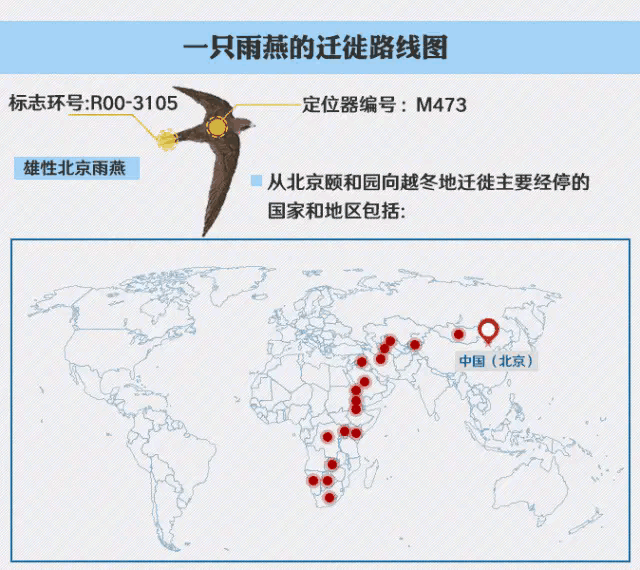 假如這是一只北京雨燕,它飛回北京的遷徙路線,是從非洲大陸的最南端,由南向北穿越非洲大陸,進入西亞,到中亞,到蒙古,到北京。