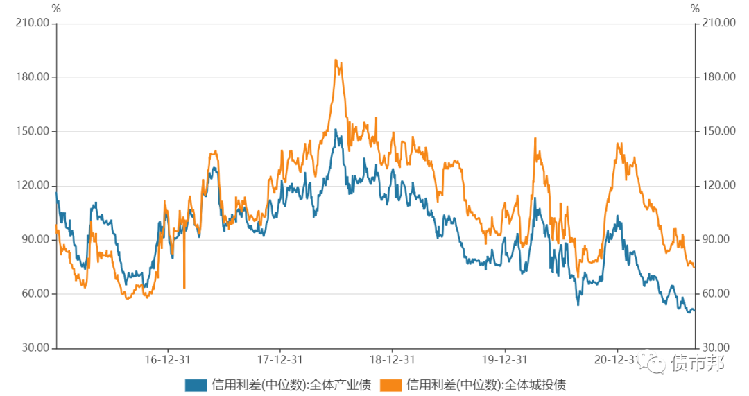 信用利差也在買買買的聲浪中被壓縮到極致,城投債利差來到了近年來的一個低點區域,產業債的利差更是打破了2016年資產荒時候的最低記錄。