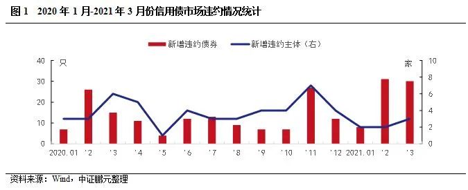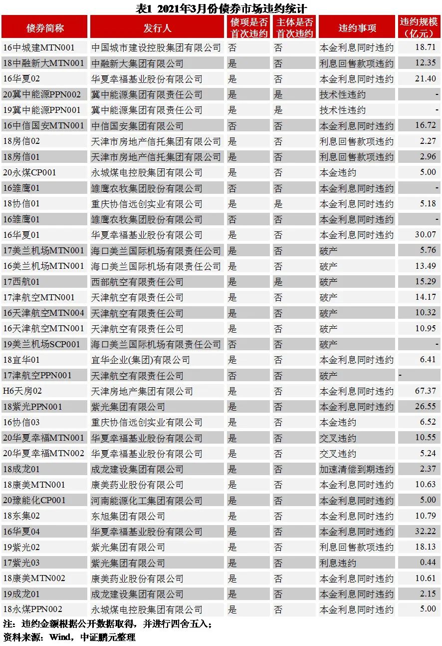 2021年3月,新增違約主體3家,分別是西部航空有限責(zé)任公司、重慶協(xié)信遠(yuǎn)創(chuàng)實(shí)業(yè)有限公司、冀中能源集團(tuán)有限責(zé)任公司。