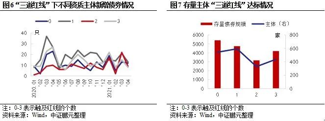 “三道紅線”對(duì)不同主體發(fā)行新的債券產(chǎn)生一定影響,從圖6看,觸及3條紅線[3]的企業(yè)再融資數(shù)量僅次于觸及1條紅線的企業(yè),但進(jìn)入2021年來,該類企業(yè)新增債券數(shù)量出現(xiàn)下降。在存量債券發(fā)行主體1902個(gè)樣本中,觸及1條紅線的企業(yè)占比31.23%,觸及2條紅線的企業(yè)占比17.25%,觸及3條紅線的企業(yè)占比22.98%,其中,協(xié)信遠(yuǎn)創(chuàng)觸及3條紅線。從存量債券規(guī)模看,觸及3條紅線的企業(yè)存量債券規(guī)模也較大。從指標(biāo)看,凈負(fù)債率未達(dá)標(biāo)的企業(yè)數(shù)量最多,占比63%,凈負(fù)債率和現(xiàn)金短債比未達(dá)標(biāo)企業(yè)占比分別為53%和50%。整體看,地產(chǎn)新政策對(duì)企業(yè)再融資的壓力不容忽視,尤其是財(cái)務(wù)表現(xiàn)較差的企業(yè),需要關(guān)注其債券以外的再融資渠道。對(duì)于資產(chǎn)受限程度高,銷售情況不理想的企業(yè),風(fēng)險(xiǎn)或逐步暴露。