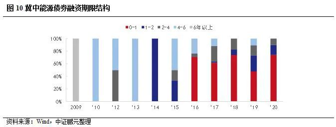 冀中能源的風(fēng)險(xiǎn)主要是債務(wù)結(jié)構(gòu)不合理。第一,外部融資以借款為主,且流動(dòng)負(fù)債占比超過60%。債券融資規(guī)模從2018年出現(xiàn)明顯增長,而償還高分期就出現(xiàn)在2019年和2020年,說明融資期限以短期為主,從圖10中可以明顯看出1年期以下債券占比超過50%,2020年新增債券期限在3年以下,若考慮回售日,則償還壓力或提前至2022年。第二,少數(shù)股東權(quán)益占比高,母公司層面負(fù)債率高企,且常年虧損。資產(chǎn)負(fù)債率常年維持在90%以上,流動(dòng)負(fù)債占比增長迅速,從2017年的47%增長至2020年三季度末的73%,而利潤常年為負(fù)。第三,受永煤控股違約影響,公司再融資受限,2020年5月以來公司未新增債券。整體看,債務(wù)集中到期,加上可用現(xiàn)金不足,應(yīng)付預(yù)付款項(xiàng)占比高,資產(chǎn)變現(xiàn)能力較弱,疊加新冠疫情影響,冀中能源的償付壓力凸顯。