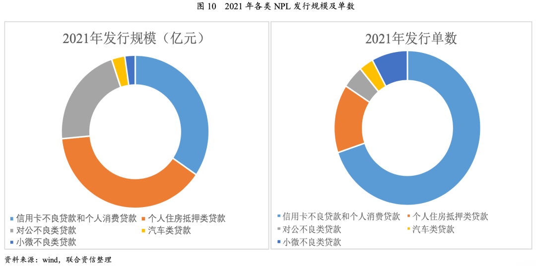 2021年發行的NPL產品中有44單以信用卡不良貸款和個人消費貸款為基礎資產,證券發行規模合計為103.51億元,占NPL總發行規模的34.51%,涉及不良貸款本息費達1185.68億元。