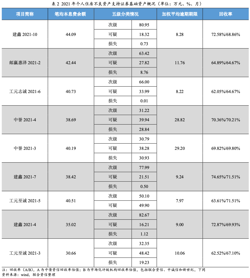 以2021年新發行不良ABS項目為例,截至2021年底,本年度新發行的不良ABS項目中,除27單尚未達到首次支付日的項目以外,有14單項目優先檔證券已經兌付完畢,其中11單為信用卡不良貸款ABS,2單為消費貸不良貸款ABS,1單為汽車不良貸款ABS。優先檔證券未完全兌付項目中,有14單項目的優先檔證券已兌付50%以上,其中11單為信用卡不良貸款ABS,2單為消費貸不良貸款ABS,1單為小微企業不良貸款ABS;有6單項目的優先檔證券兌付20%-50%,其中4單為信用卡不良貸款ABS,1單為消費貸不良貸款ABS,1單為個人住房抵押不良貸款ABS;有2單項目優先檔證券兌付低于10%,均為個人住房抵押不良貸款ABS。從優先檔證券的兌付情況看,信用卡、消費貸這類個人信用類不良貸款ABS的兌付速度快于有抵押的個人住房不良貸款ABS和小微企業不良貸款ABS。